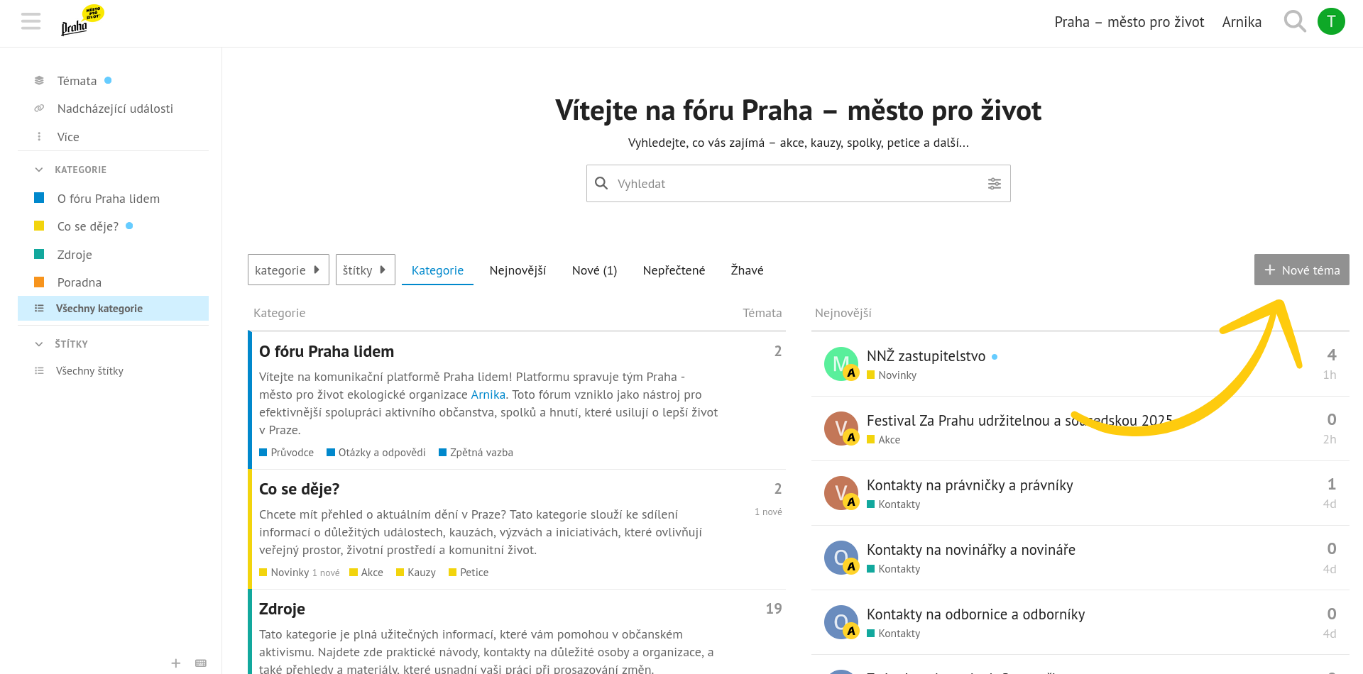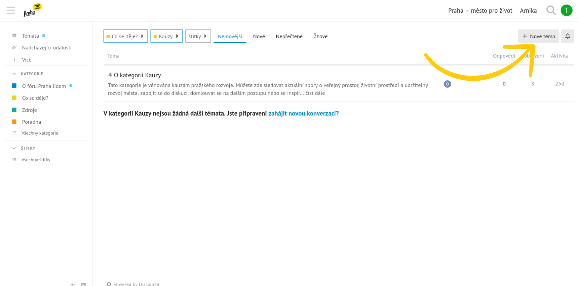 Po přihlášení uvidíte v pravo šedivé tlačítko + Nové téma.