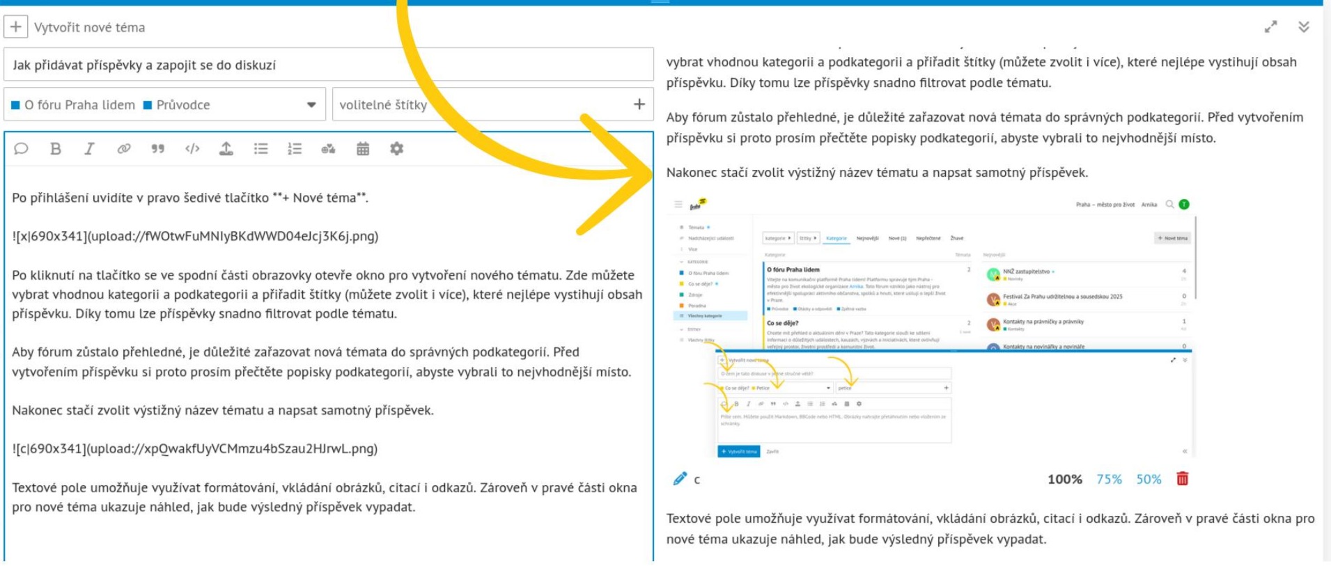 Textové pole umožňuje využívat formátování, vkládání obrázků, citací i odkazů. Zároveň v pravé části okna pro nové téma ukazuje náhled, jak bude výsledný příspěvek vypadat.