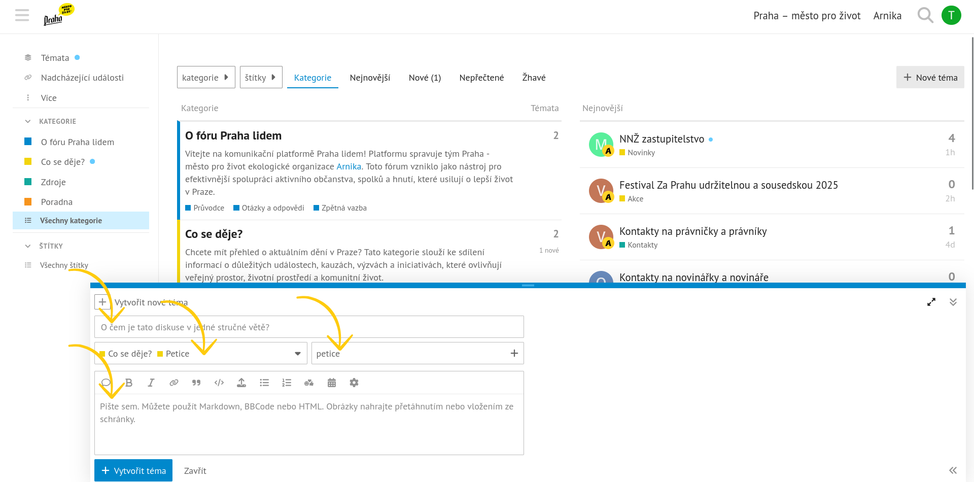 Po kliknutí na tlačítko Nové téma se ve spodní části obrazovky otevře okno pro vytvoření nového tématu. Zde můžete vybrat vhodnou kategorii a podkategorii a přiřadit štítky (můžete zvolit i více), které nejlépe vystihují obsah příspěvku. Díky tomu lze příspěvky snadno filtrovat podle tématu.